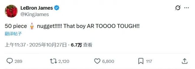 詹姆斯赛后发推庆祝:“50 块鸡块!!!!! 那男孩AR太强了!!”